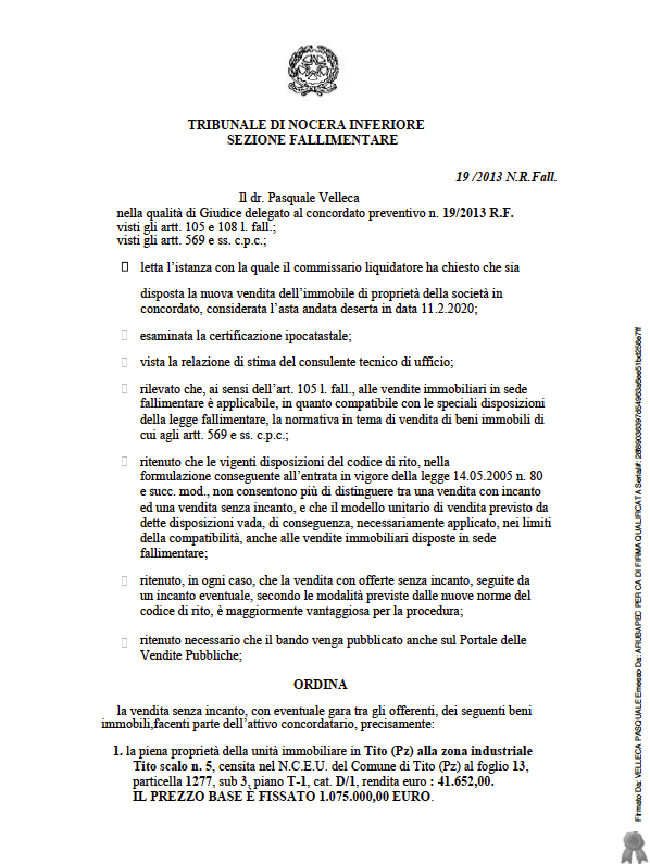 | Concordato Preventivo n. 19/2013 del Tribunale di Nocera Inferiore |