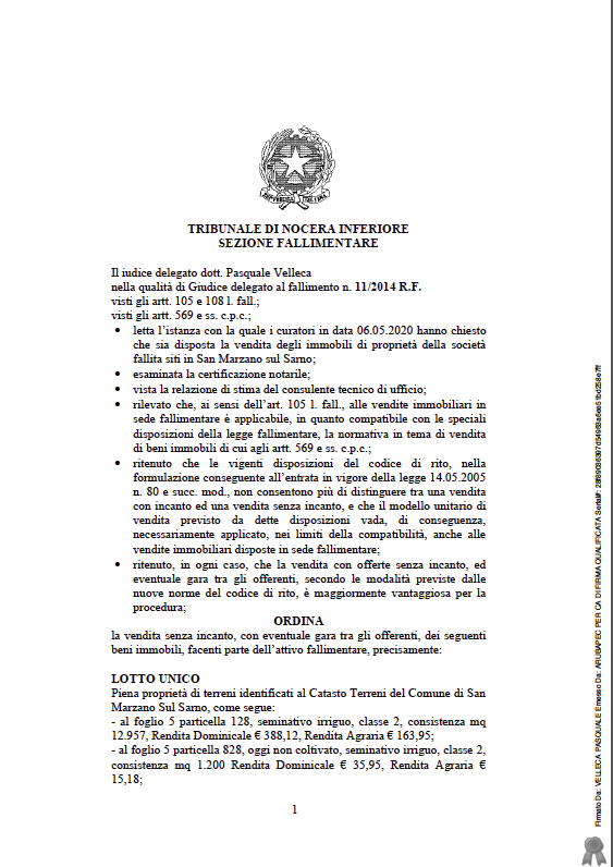 | Fallimento n. 11/2014 R.F. del Tribunale di Nocera Inferiore |