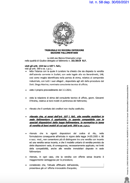| Fallimento n. 33/2019 R.F. del Tribunale di Nocera Inferiore |