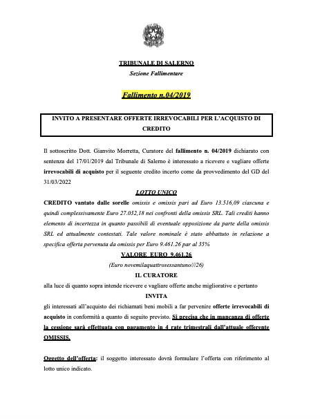 | Fallimento n. 4/2019 del Tribunale di Salerno |